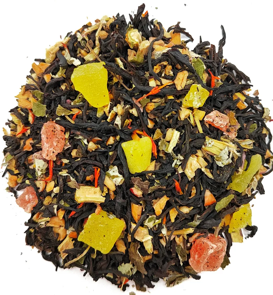 Состав: Чёрный чай Ассам, цукаты, яблоко, лист малины, сафлор, натуральные ароматические масла айва и персик